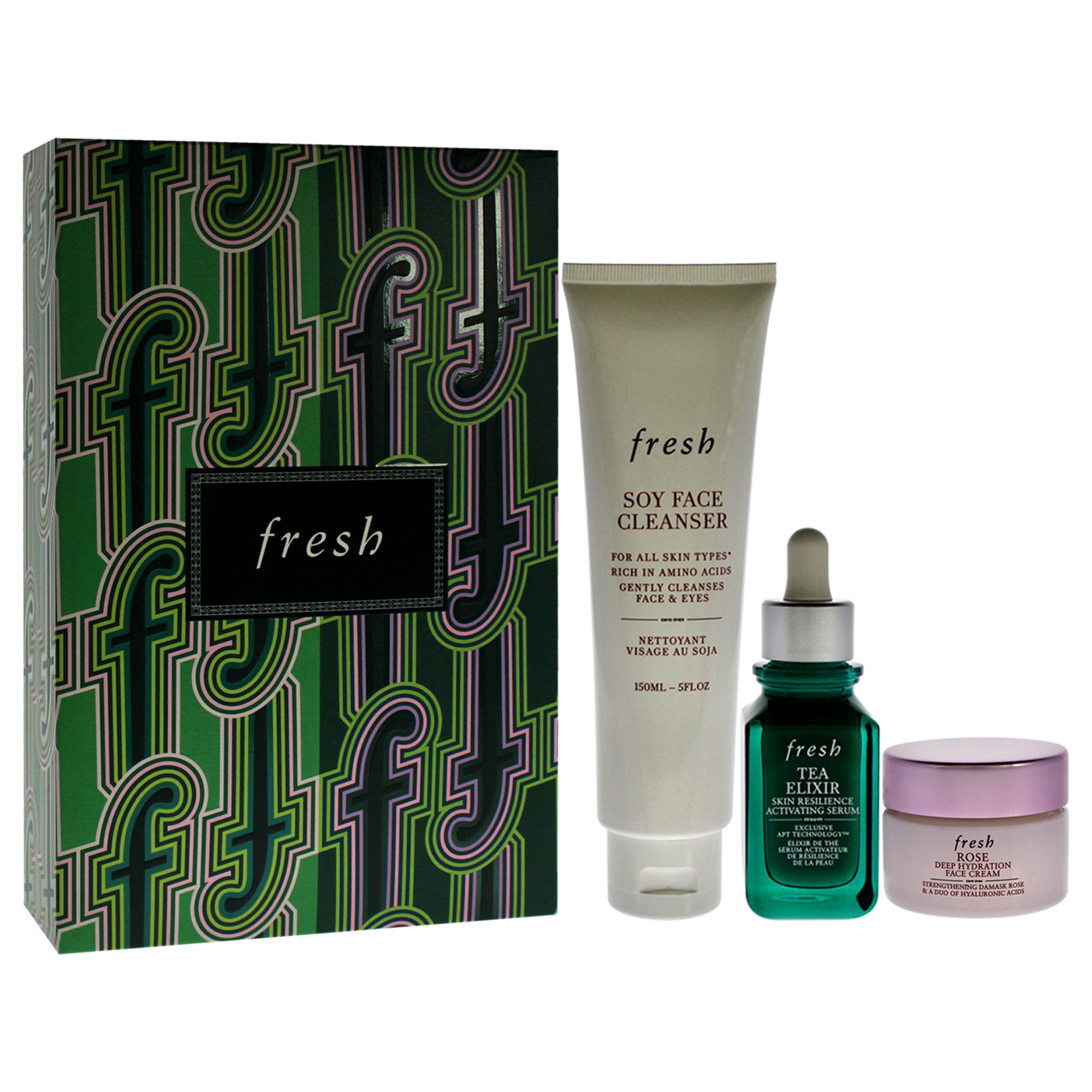 Resilient Hidrated Skin Trio by Fresh for Women - 3 Pc 5oz Soy Face Cleanser, 1oz Elixir Skin Resilience Activating Serum - Tea, 0.5oz Deep Hidration Face Cream - Rose